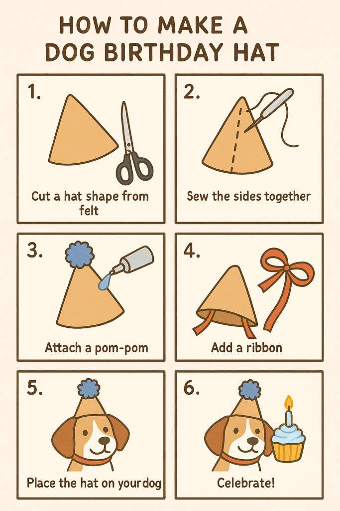 Dogs see colors differently from humans — mostly blues and yellows rather than reds and greens. Choosing a hat with high-contrast colors can make it visually stimulating for your pet. Add soft, chew-safe decorations like felt pom-poms or embroidered numbers instead of plastic glitter, which can be swallowed.