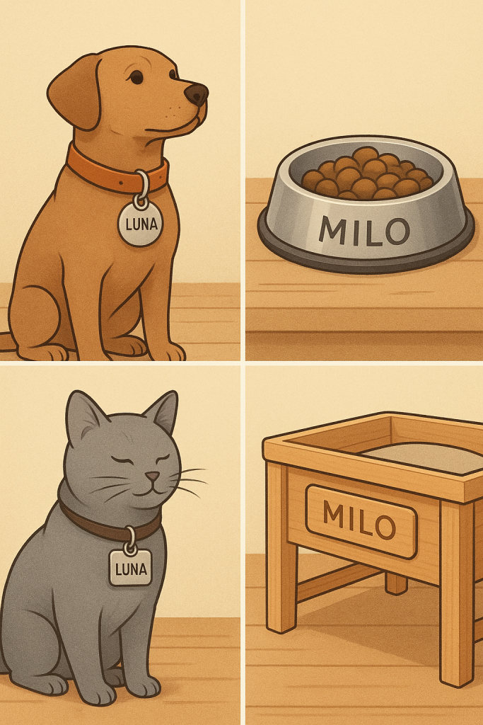 Why not let your pet’s dining space carry a personal mark? Stainless-steel or ceramic bowls with engraved names turn mealtime into a daily ritual of recognition. Each bite begins with identity. Some artists even engrave feeding stations made from reclaimed wood, transforming simple bowls into heirlooms of companionship.